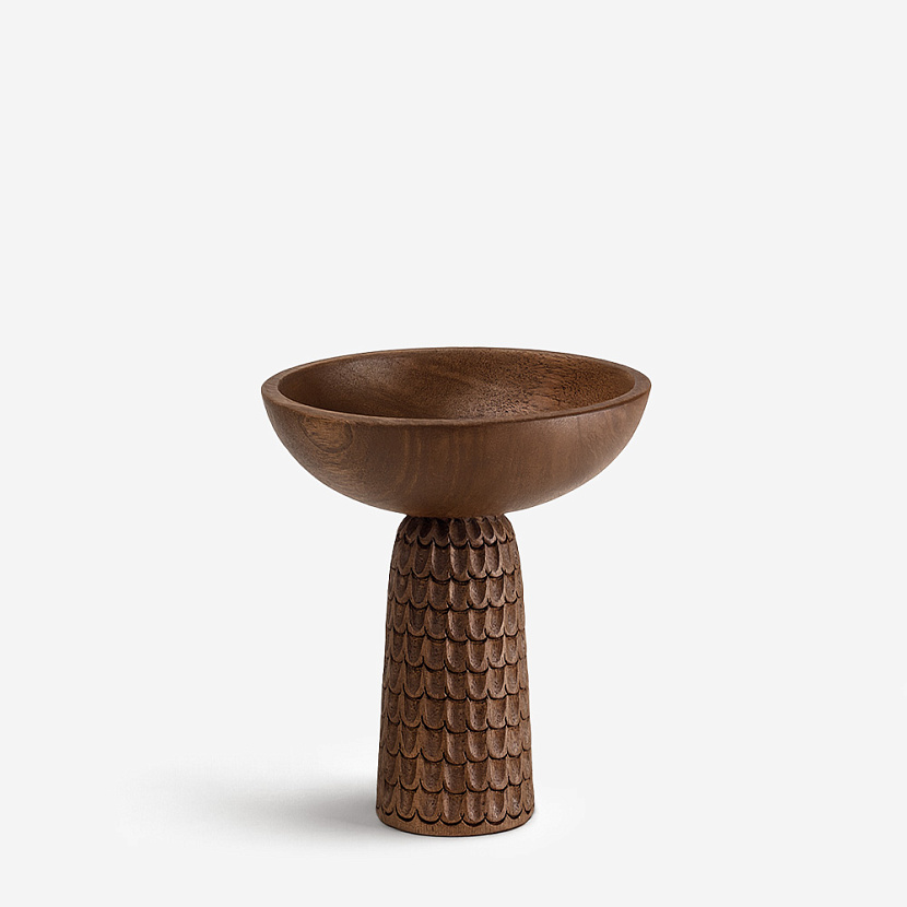 Высокая чаша Nera из массива ореха c рельефной резьбой на основании, размер S. Лёгкое деревянное изделие с яркой национальной притягательностью разработано скандинавским дизайнером Моникой Фёрстер (Monica Förster). Чаша изготовлена вручную в Боснии и Герцеговине. Уникальная резьба, украшающая поверхность чаши, выполнена в традиционной боснийской технике, внесённой в список нематериального наследия ЮНЕСКО.