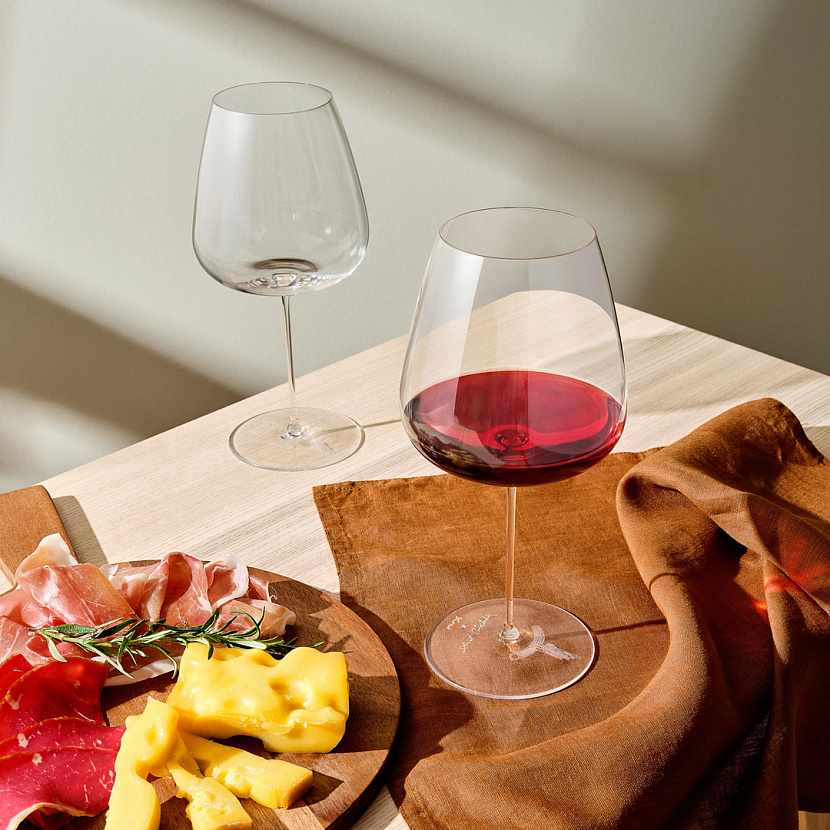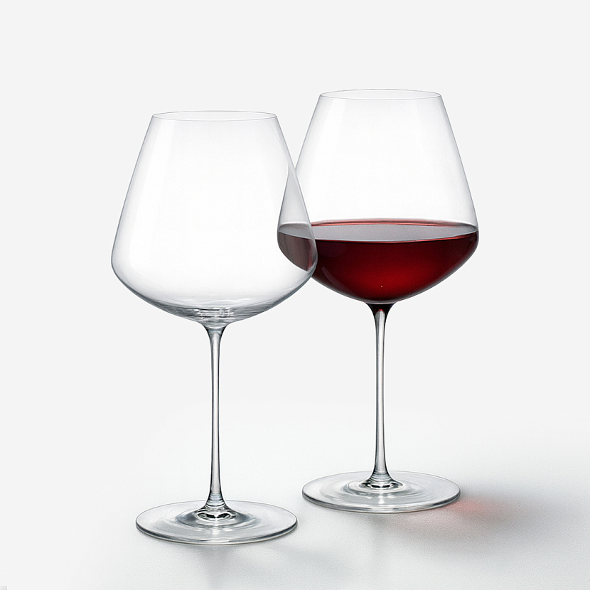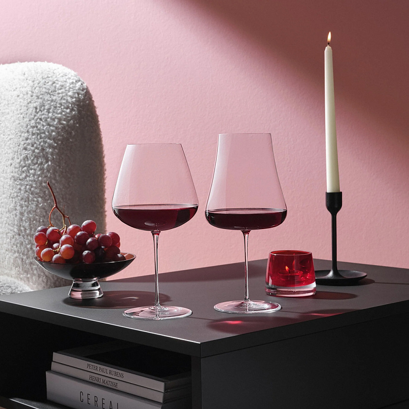 Два бокала для красного вина Stem Zero Vertigo. Форма изделий раскрывает тонкие нюансы вкуса напитка. Большие бокалы Stem Zero украсят как праздничный, так и повседневный стол.