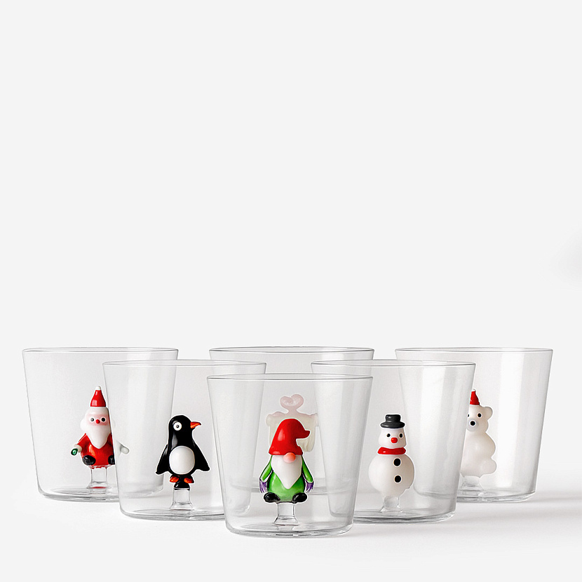 Набор из шести стаканов из рождественской коллекции Christmas Tales итальянского бренда Ichendorf, в комплект входит по одному стакану с выдувными фигурками: Санты, пингвина, полярного медведя, подарка, эльфа и снеговика.