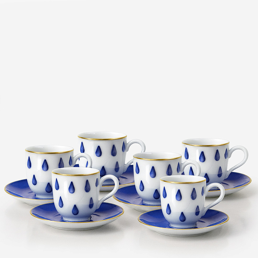Набор из шести кофейных пар Atlantico. Характерный для серии кобальтовый синий — отсылка к глубокому цвету Атлантического океана, одного из неофициальных символов Португалии. Все изделия украшены золотой окантовкой. Дизайн — Филипа Рикардо (Filipa Ricardo). Набор изготовлен вручную мастерами компании Porcel 1987.