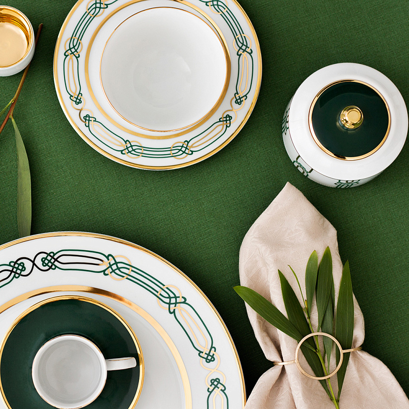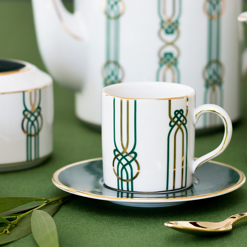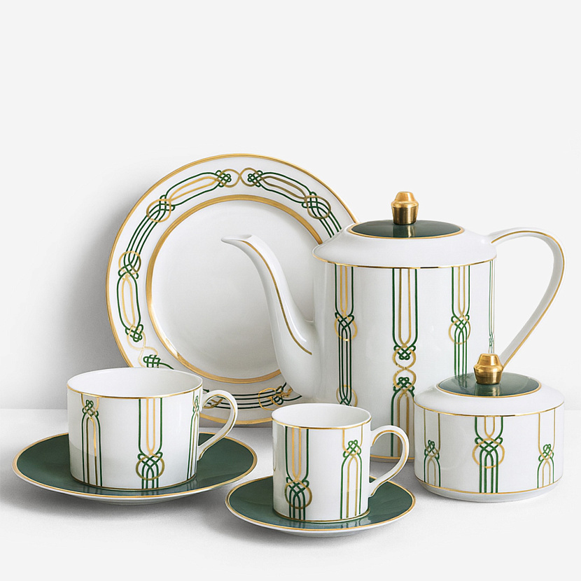 Чайно-кофейный сервиз Liberty в неустаревающем цветовом сочетании золотого и зелёного. Фарфоровые изделия, искусно расписанные вручную мастерами португальской компании Porcel 1987, придадут сервировке стола особое изящество и благородство.