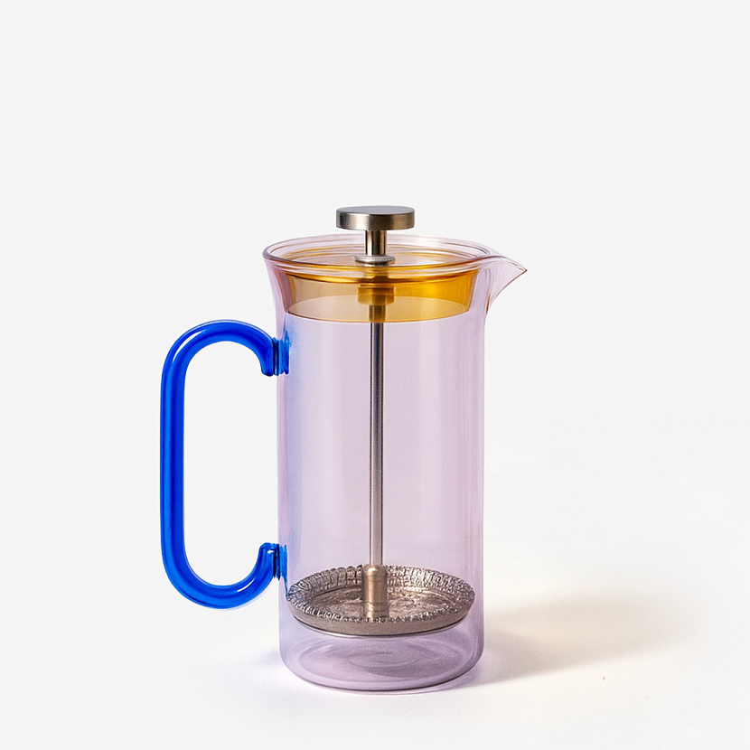 Френч-пресс Clarinette, размер L. Изделие изготовлено из выдувного стекла трёх цветов — жёлтого, розового и синего. Идеально подойдёт для ежедневного использования дома или в офисе. Дизайн разработан Næssi Studio специально для Ichendorf.