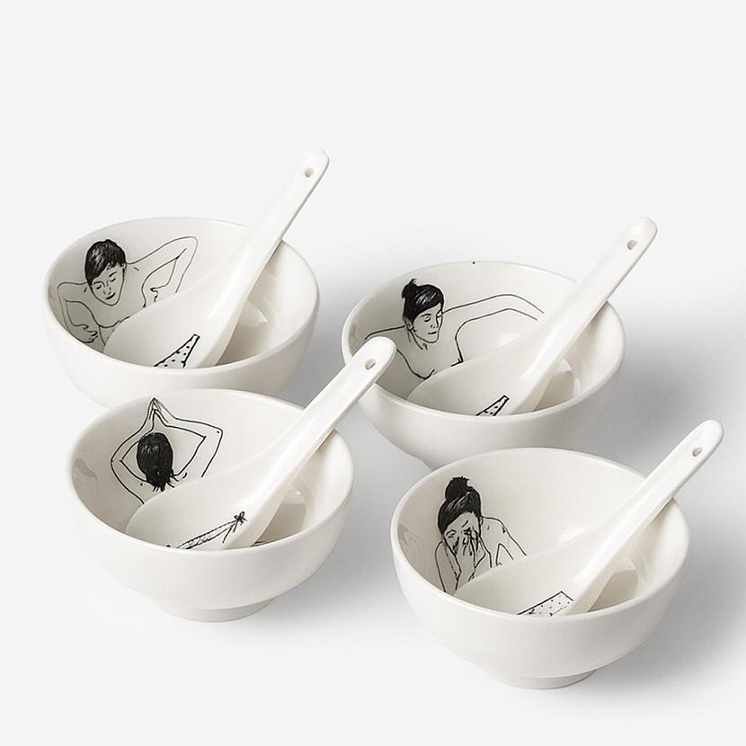 Набор чаш с ложками Undressed от нидерландского бренда Pols Potten. В комплект входят четыре глубоких чаши и четыре ложки. Дизайн изделий разработан совместно с художницей Эстер Хёрхнер (Esther Hörchner). Все предметы серии выполнены из белого глазурованного фарфора.
