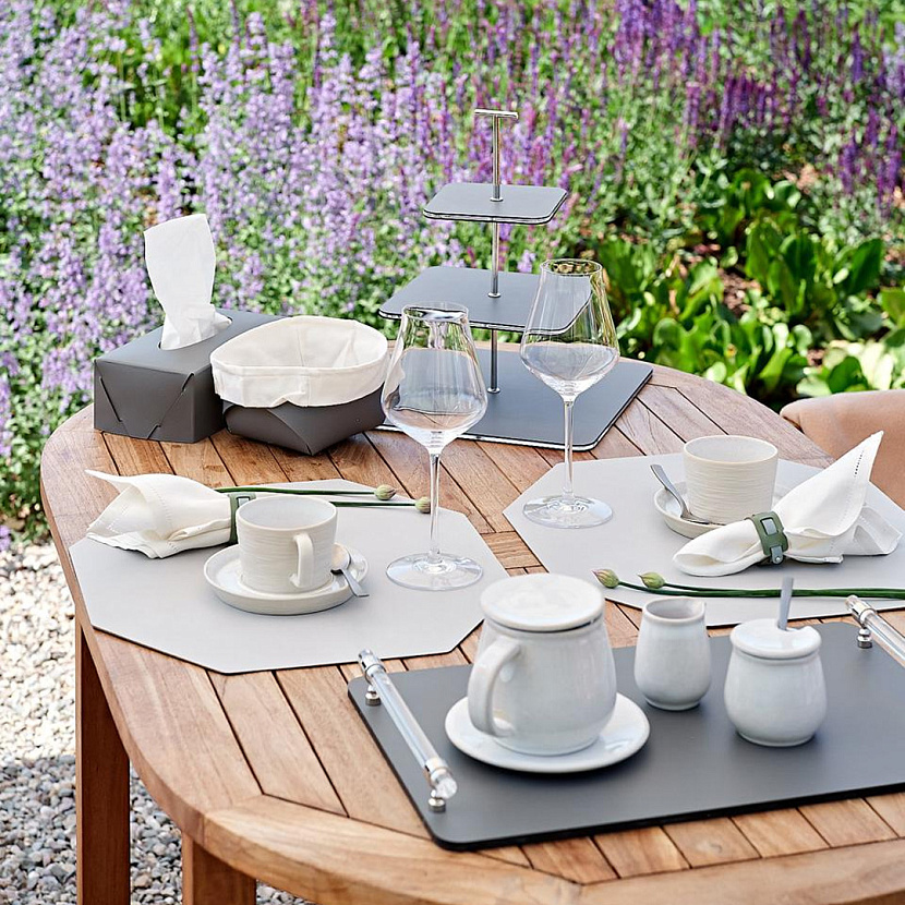 Корзина Flora, изготовлена из кожи серого цвета. Размер S. Популярное решение для оформления стола — поставить в центр корзину и наполнить её фруктами, орехами, конфетами или цветами. Любой вариант будет уместно сочетаться как с праздничным, так и с повседневным застольем.
