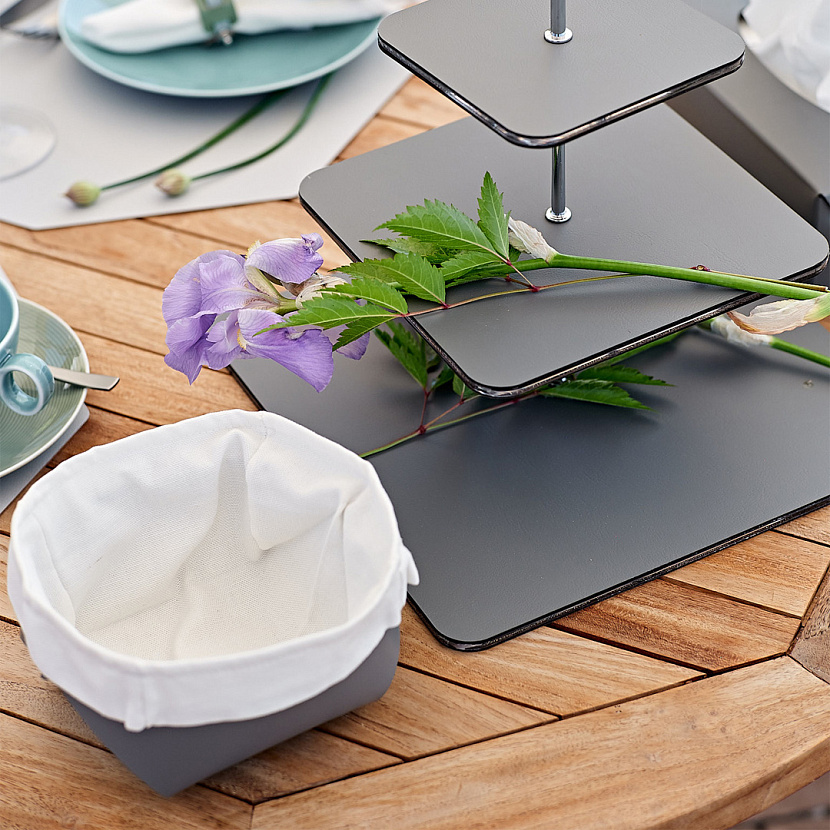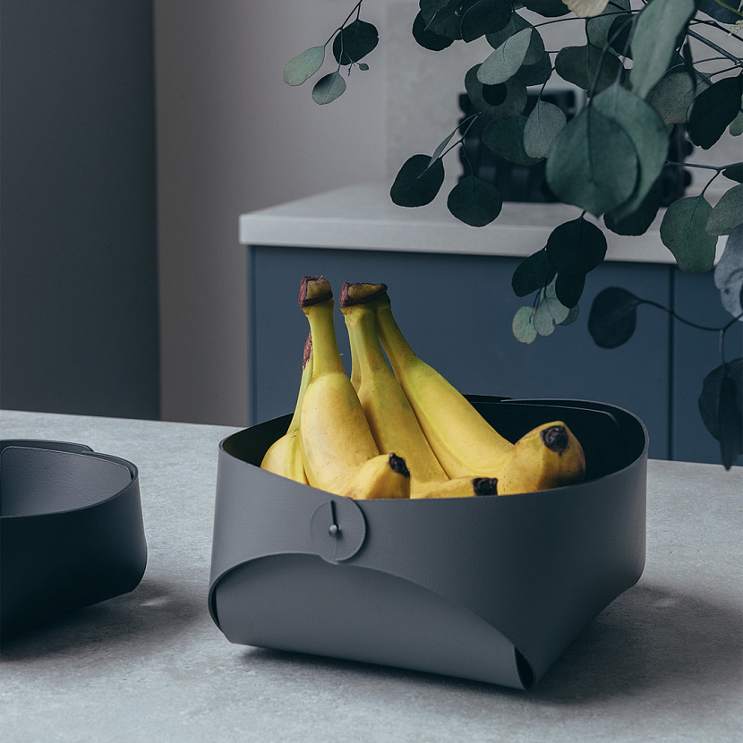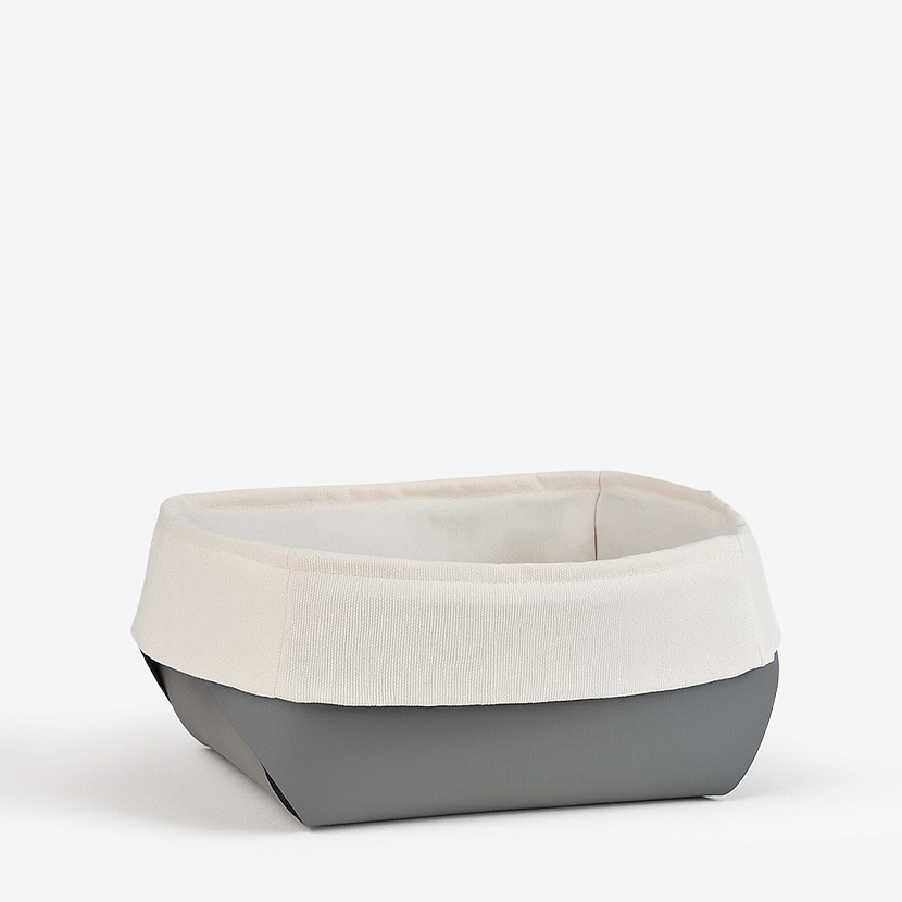 Корзина Flora, изготовлена из кожи серого цвета. Размер L. Популярное решение для оформления стола — поставить в центр корзину и наполнить её фруктами, орехами, конфетами или цветами. Любой вариант будет уместно сочетаться как с праздничным, так и с повседневным застольем. Хлопковый мешочек в комплекте.