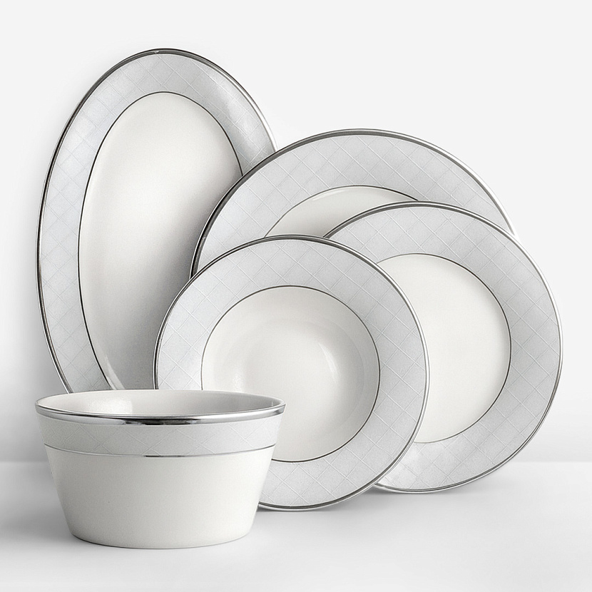 Обеденный сервиз Ethereal White на шесть персон. Платиновая окантовка придаёт изделиям из фарфора особую утончённость; еле заметный узор в клетку — изящный штрих, подчёркивающий чистоту белого цвета. Дизайн — Хелена Бойя (Helena Bóia). Сервиз изготовлен вручную мастерами компании Porcel 1987.