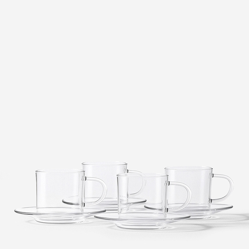 Набор Moment из 4 лаконичных кофейных чашек с блюдцами. Изделия изготовлены из боросиликатного стекла, подходят для мытья в посудомоечной машине.