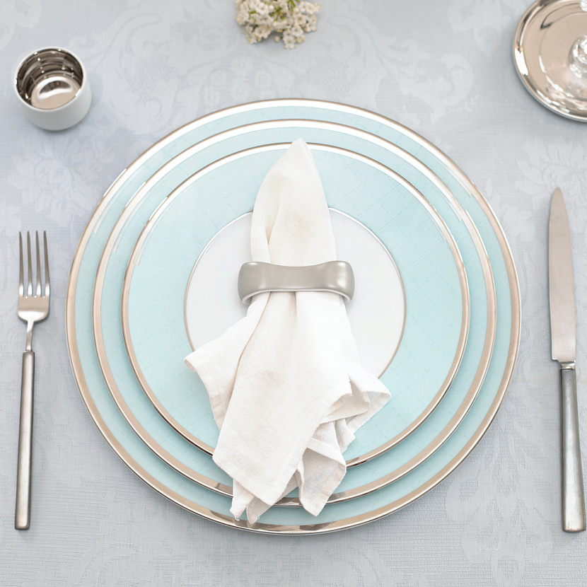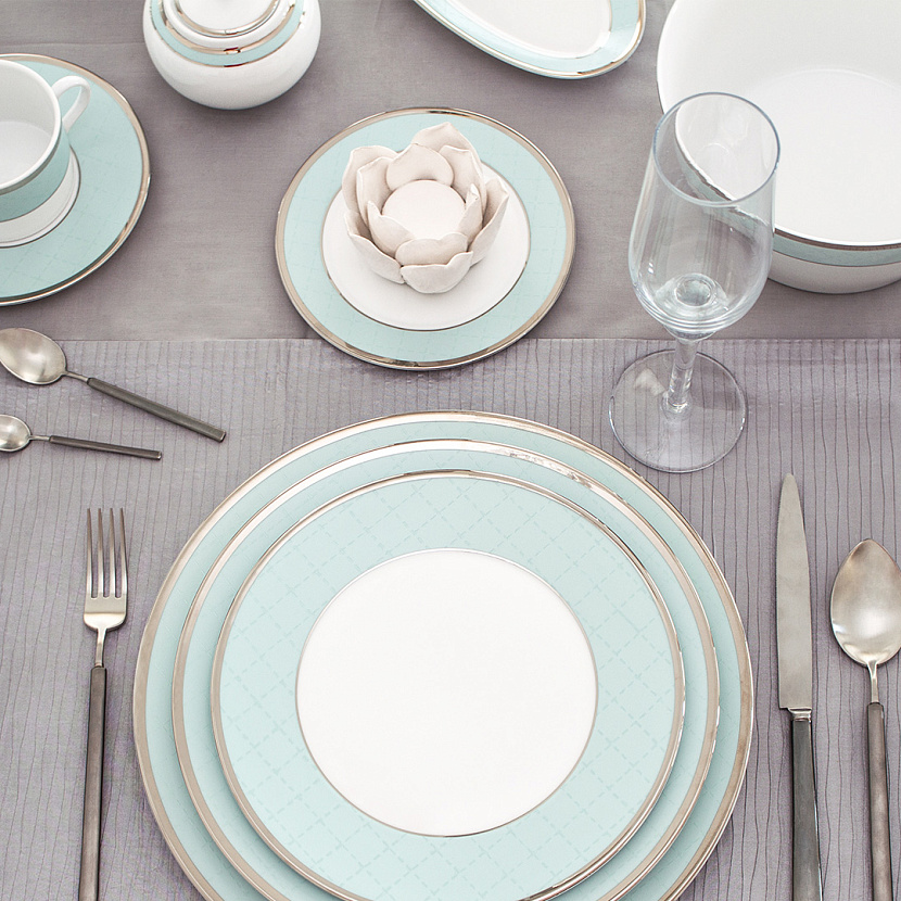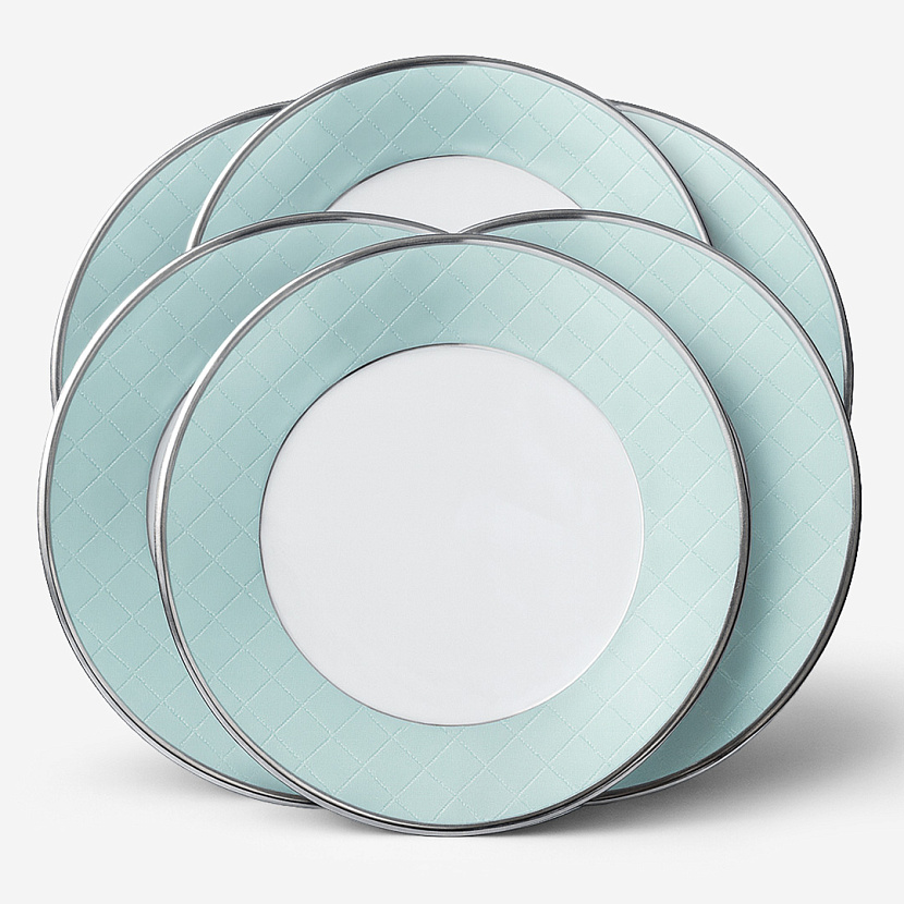 Набор из шести десертных тарелок Ethereal Blue. Цветовое сочетание — нежно-голубой с белым. Платиновая окантовка придаёт изделиям из фарфора особую утончённость; еле заметный узор в клетку — изящный штрих, подчёркивающий чистоту белого цвета. Дизайн — Хелена Бойя (Helena Bóia). Изготовлено вручную мастерами компании Porcel 1987.
