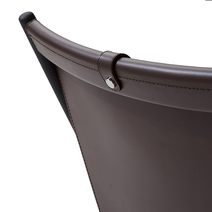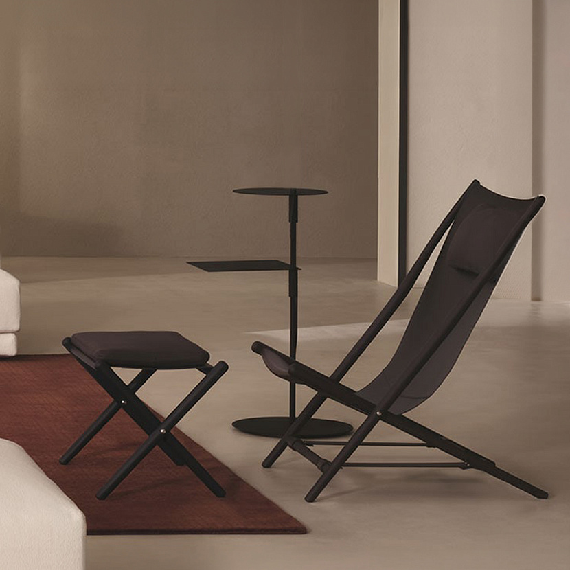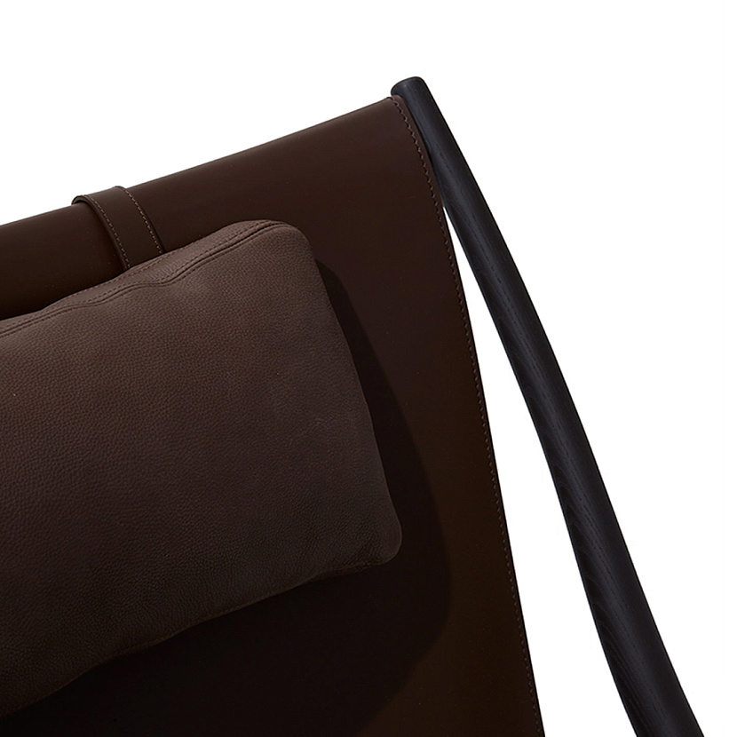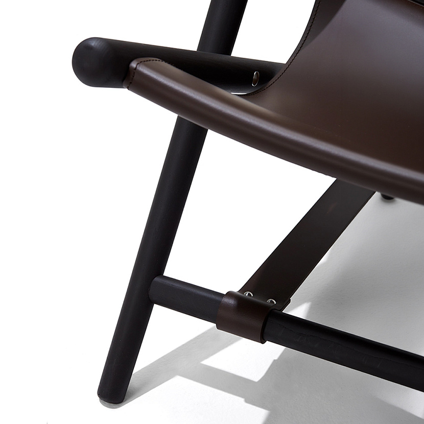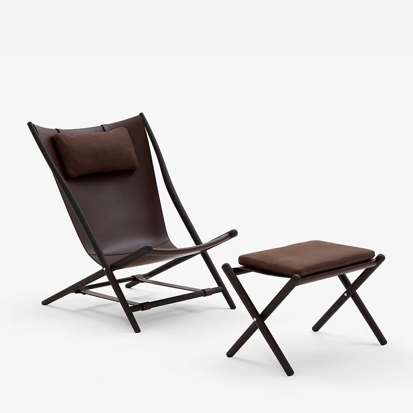 Кресло с оттоманкой D’Antan с деревянным каркасом из ясеня темного цвета обтянутого плотной кожей коричневого цвета. Кресло имеет съемную подушку для поддержания головы, а оттоманка - съемную подушку для ног, также обитых кожей. Легкий каркас позволяет быстро складывать кресло, облегчая его перемещение по дому.