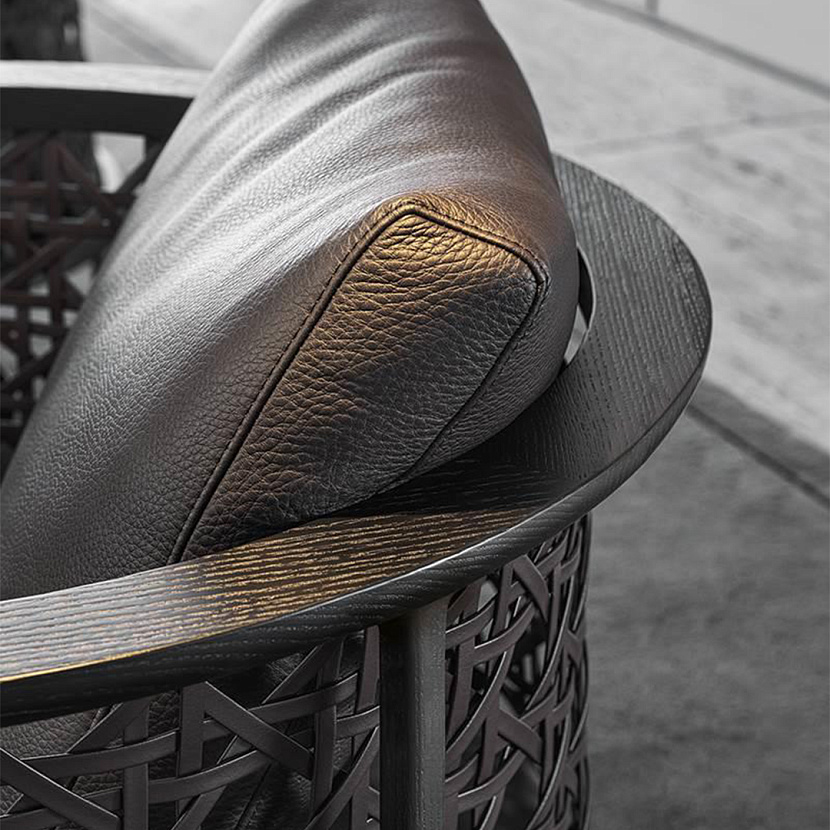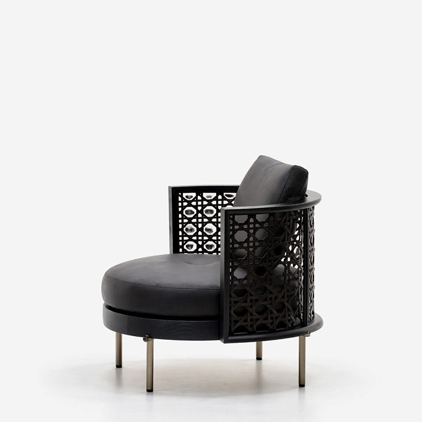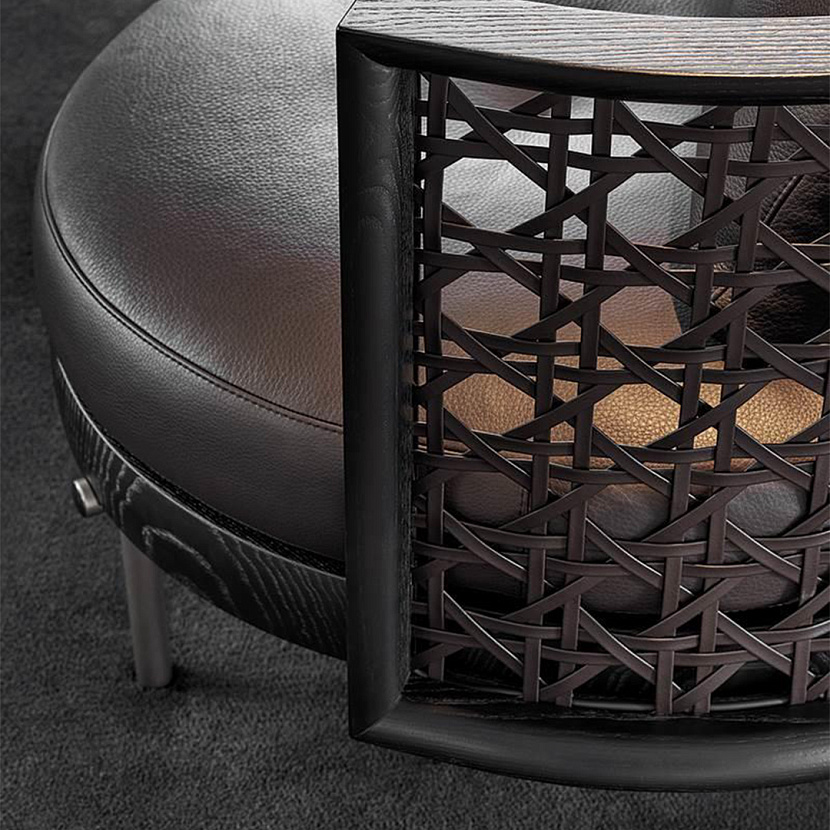 Кресло Torii Nest отличается легкой архитектурной конструкцией и мягкой округлой формой. Дизайн студии Nendo вдохновлен японскими воротами «torii» и традиционным плетением, что отражается в характерной круговой спинке с декоративной сетчатой структурой. Модель сочетает выразительную графику металлического каркаса и мягкие подушки сиденья, обеспечивая комфортную посадку. Кресло доступно в версиях с фиксированным основанием или поворотной базой swivel.