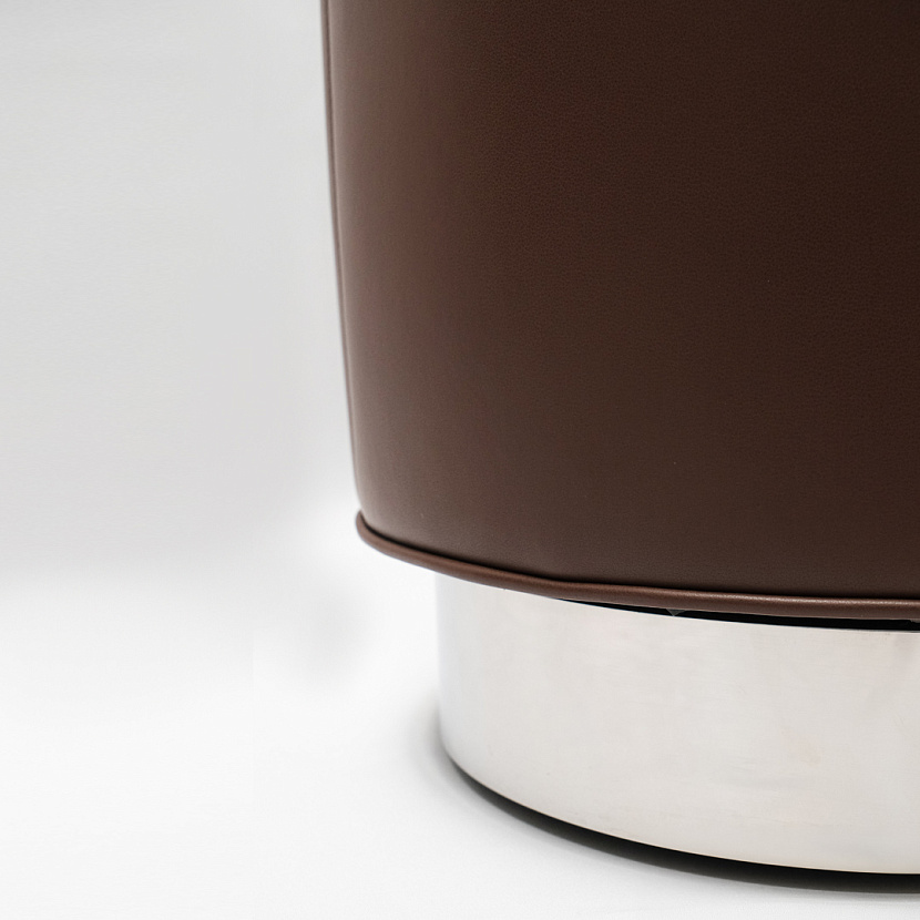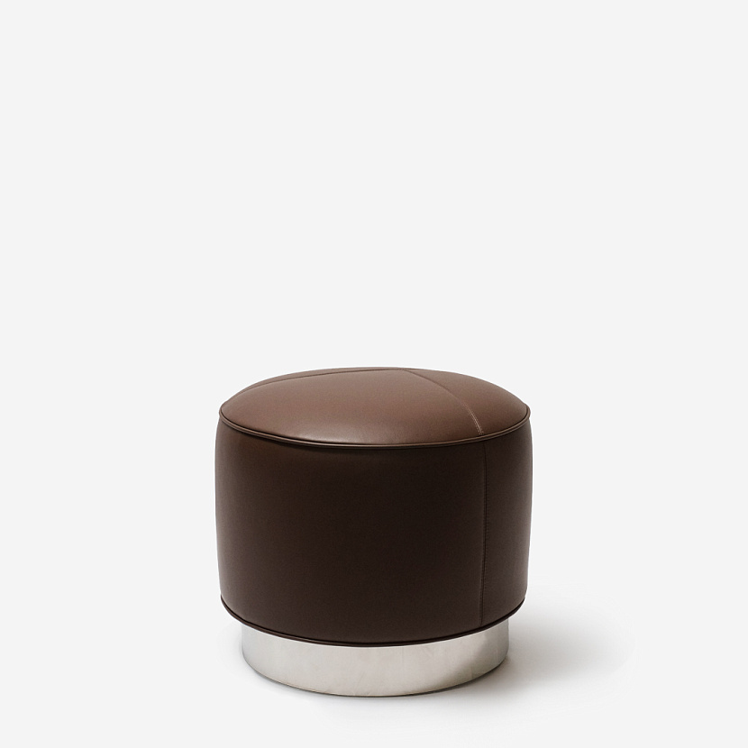 Пуф Yves — современное прочтение классического пуфа. Обивка изделия из кожи коричневого оттенка, основание изготовлено из серебристого металла.