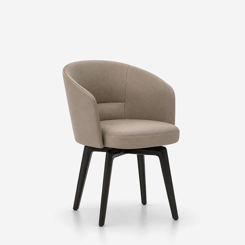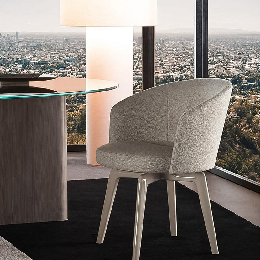 Компактный корпус с мягкой обивкой сочетается с изящным основанием, благодаря чему стул выглядит лёгким и утончённым. Модель представлена в двух версиях — с фиксированным основанием (Fixed) и с поворотной базой (Swivel) с вращением 360°.