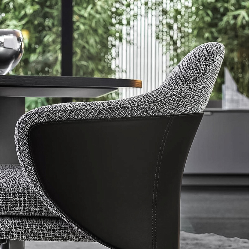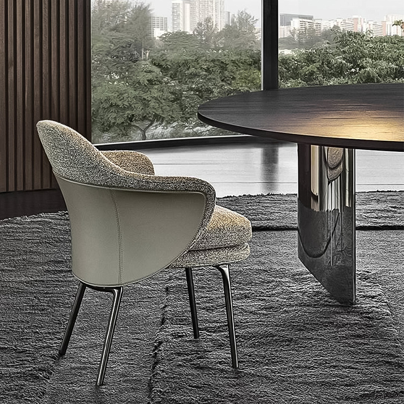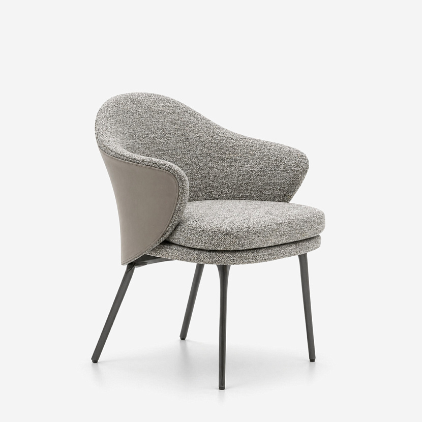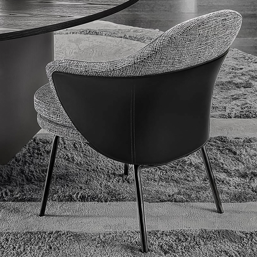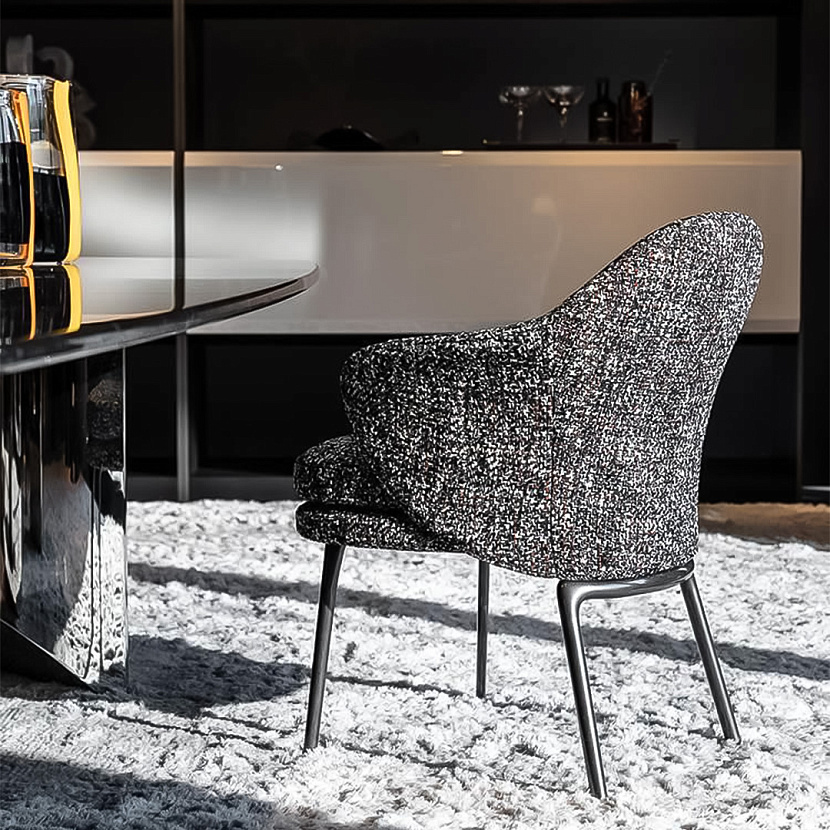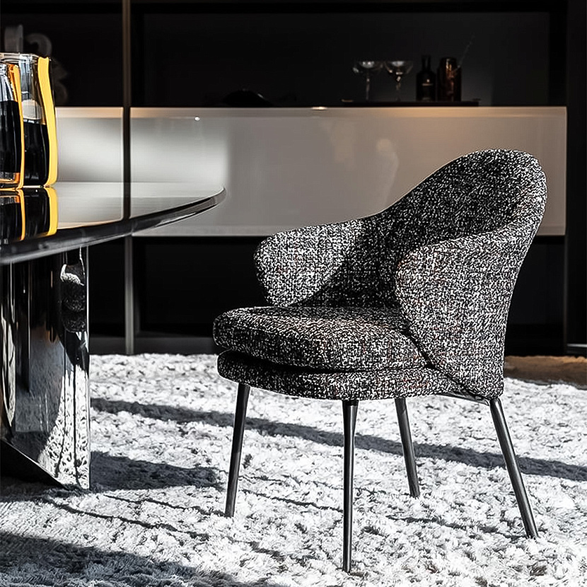 Конструкция сочетает мягкую обивку с графичным металлическим основанием, создавая баланс между комфортом и архитектурной лёгкостью. Модель представлена в двух версиях — без подлокотников и с подлокотниками, что позволяет использовать стул в различных обеденных композициях.