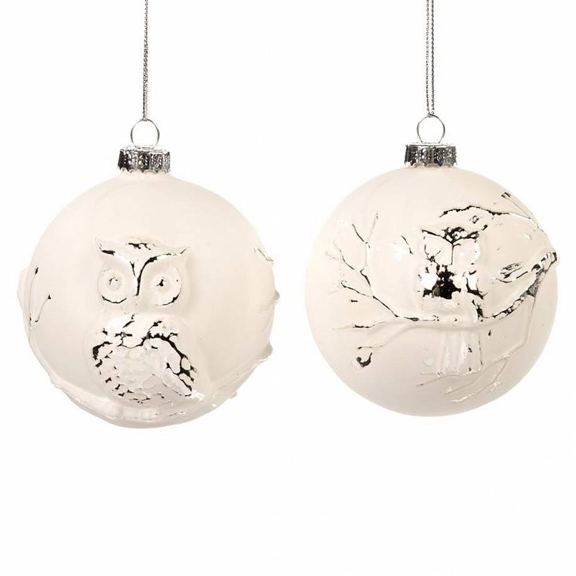 Набор из 2-х новогодних елочных украшений. Два белоснежных стеклянных шара с совами, сидящими на ветках.