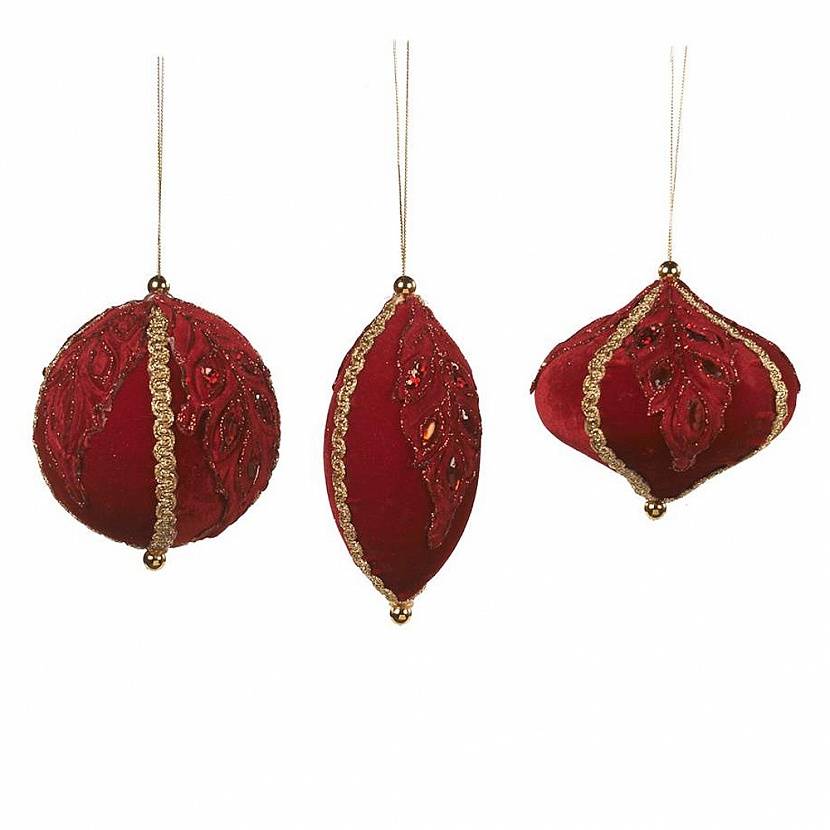 Набор из 3-х новогодних елочных украшений. Игрушки бордового цвета декорированы золотой лентой. Фактура поверхности напоминает бархат, по бокам вышит растительный орнамент.