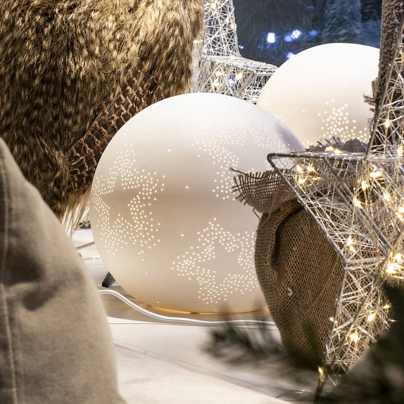 Белоснежный светящийся шар с перфорацией в виде звезд. Изготовлен вручную в Германии.