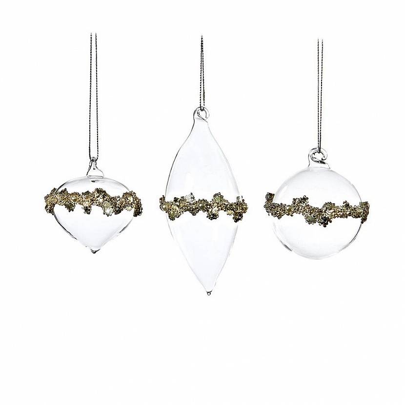 Набор из 3-х новогодних елочных игрушек. Стеклянные шары, обрамлённые золотистыми блестками и бусинами.