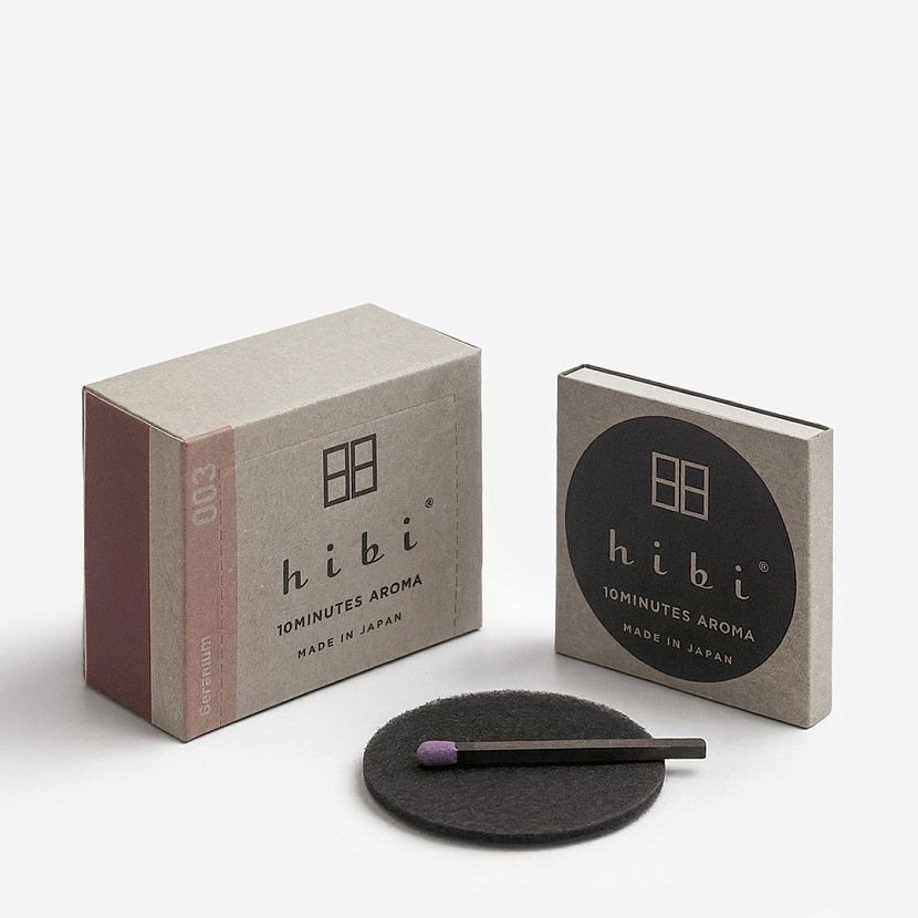Набор для ароматерапии Geranium Large Box от японского бренда Hibi. В набор входит коробка, 30 ароматических спичек, пропитанных эфирным маслом герани, и специальный огнеупорный коврик, благодаря которому можно зажечь благовоние прямо внутри коробочки.