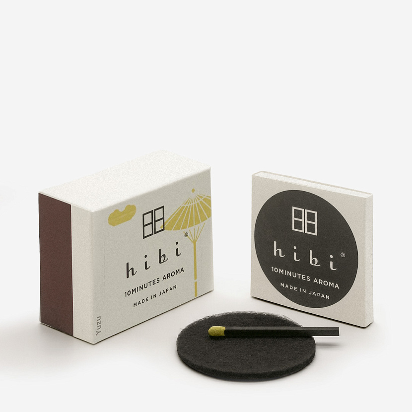 Набор для ароматерапии Yuzu Large Box от японского бренда Hibi. В набор входит коробка, 30 ароматических спичек, пропитанных эфирным маслом юдзу, и специальный огнеупорный коврик, благодаря которому можно зажечь благовоние прямо внутри коробочки.