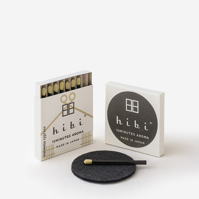 Набор для ароматерапии Japanese Cypress в дорожном формате от японского бренда Hibi. В набор входит коробок, 8 ароматических спичек, пропитанных эфирным маслом кипариса, и специальный огнеупорный коврик, благодаря которому можно зажечь благовоние прямо внутри коробочки.