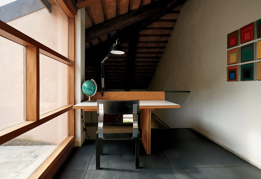 Небольшой кабинет на верхнем этаже, перестроенный в 1970-е британским архитектором Колином Гленни. Тут расположен письменный стол, за которым работал Карло Скарпа. Дополнен стулом Follia, дизайн — Джузеппе Террани, Zanotta.