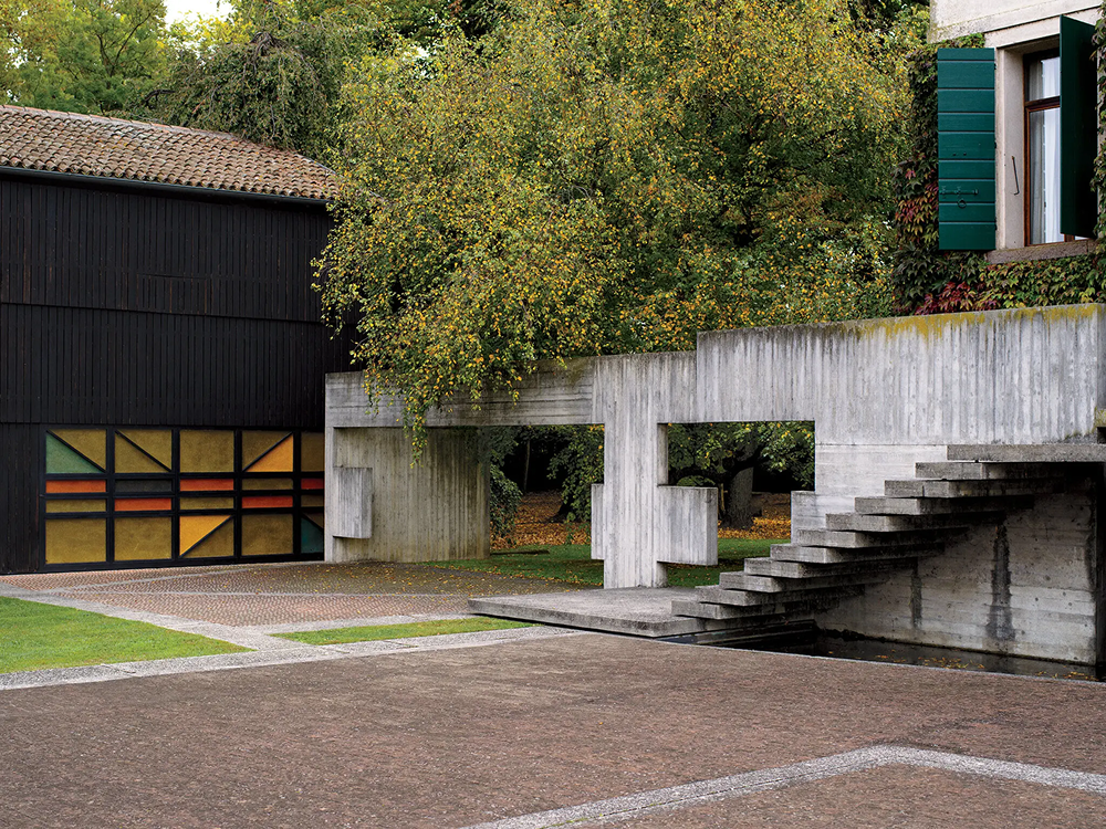 Вид на Палаццетто снаружи. Камин слева спроектирован архитектором Гастоне Парисотто в 1960-е годы, камин с правой стороны — Карло Скарпой в 1970-х. Бетонная лестница, ведущая на первый этаж, спроектирована Скарпой в 1978 году — незадолго до его смерти, — но реализована только в 2006-м под руководством сына, Тобиа Скарпы.