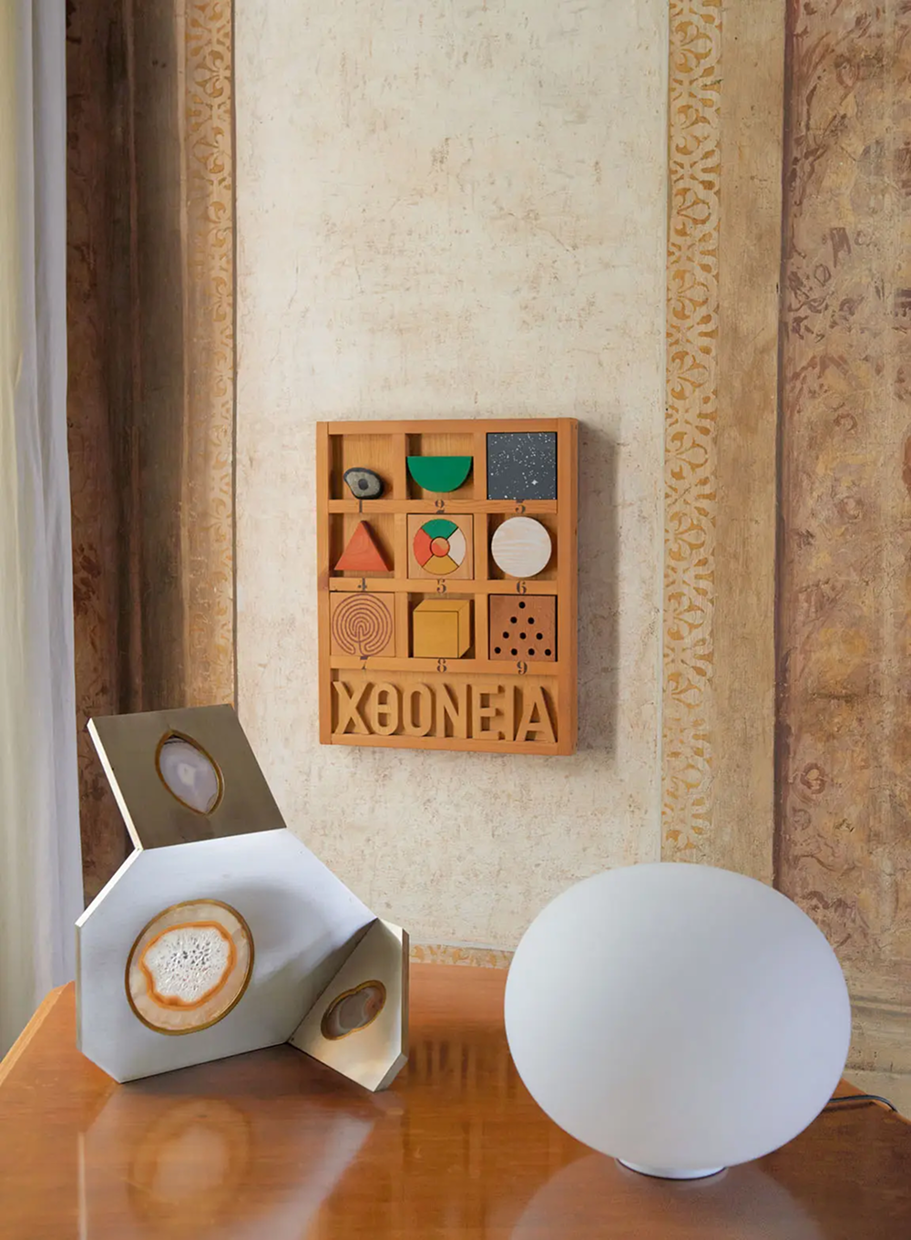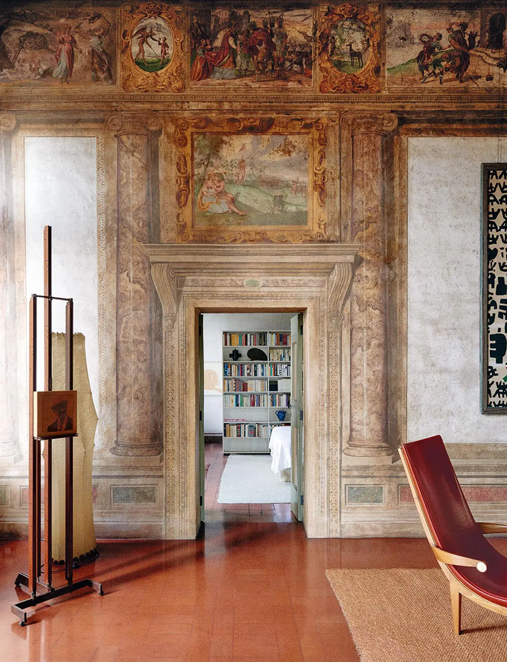 Фрески XVII века соседствуют с культовыми дизайнами XX века. Мольберт, созданный Карло Скарпой для Музея Коррер и позже использованный в Музее Кастельвччио в Вероне. На заднем плане — лампа Fantasma Grande 1960-х годов дизайна Тобиа Скарпы для Flos.