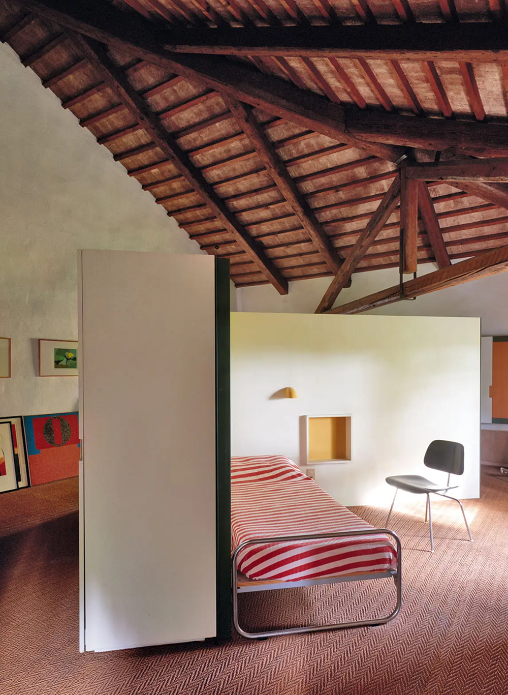Гостевая зона в открытом пространстве мансарды; стул DCM Chair Чарлза и Рэй Имзов для Vitra.