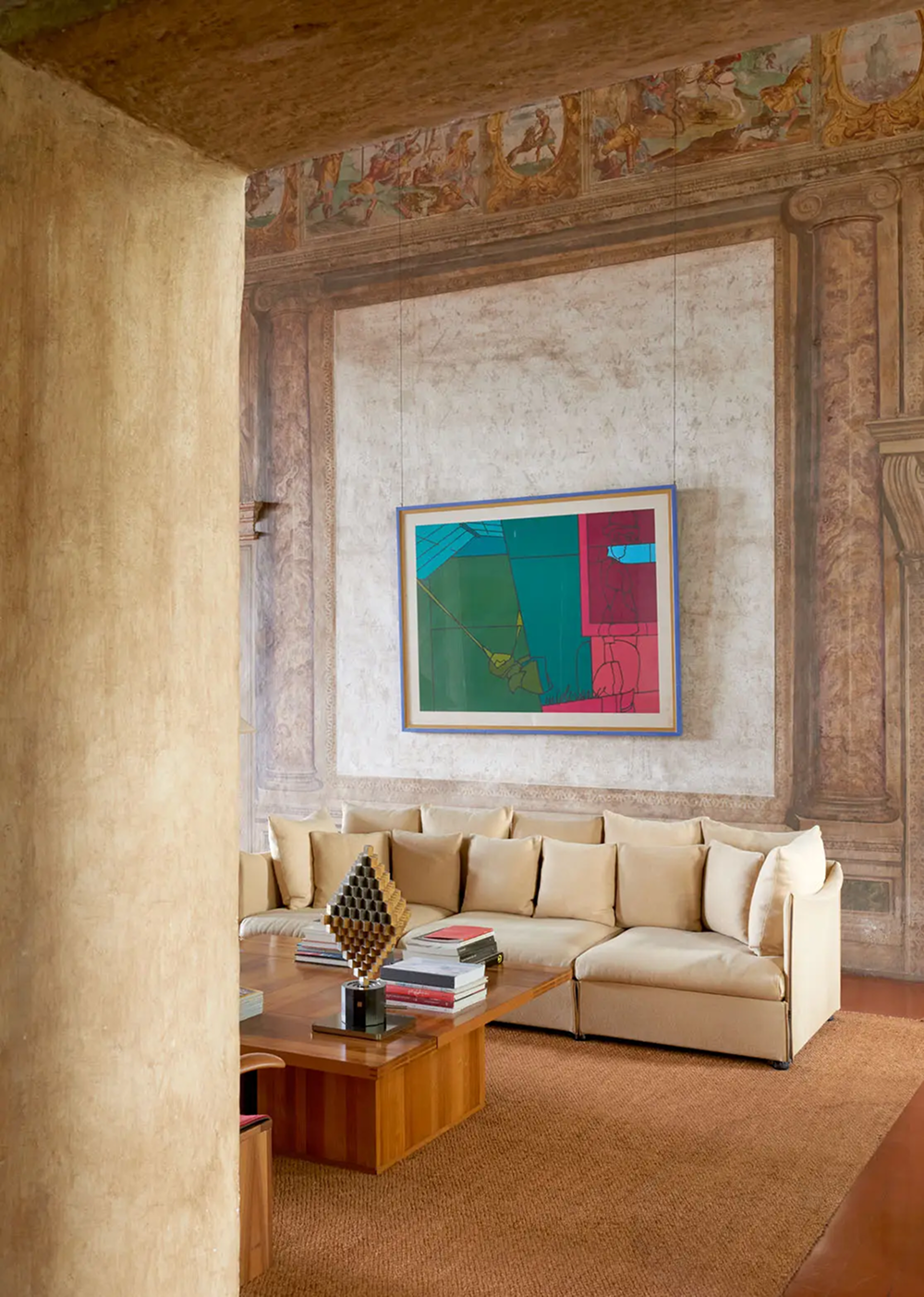 На кофейном столике — ещё одна скульптура Карло Скарпы, созданная для Итальянского павильона Венецианской биеннале 1968 года. Над диваном Char à Bank Марио Беллини для Cassina — работа Валерио Адами.