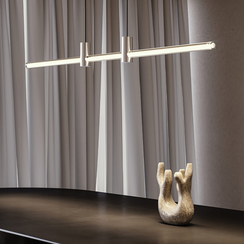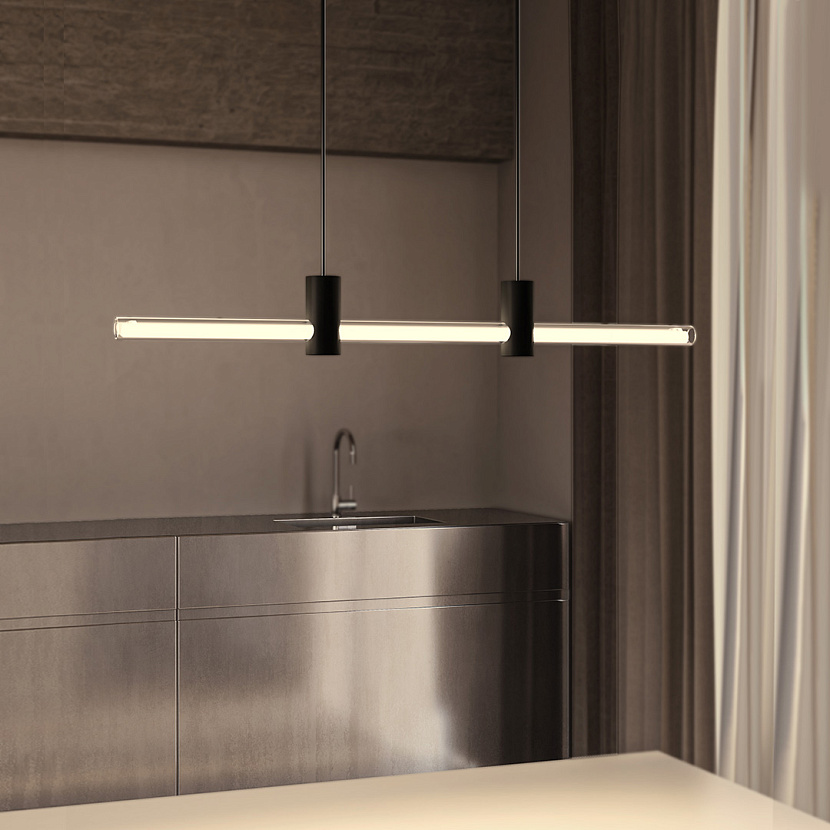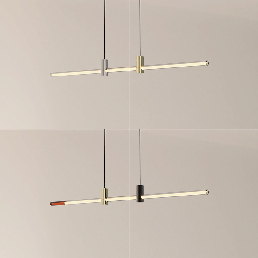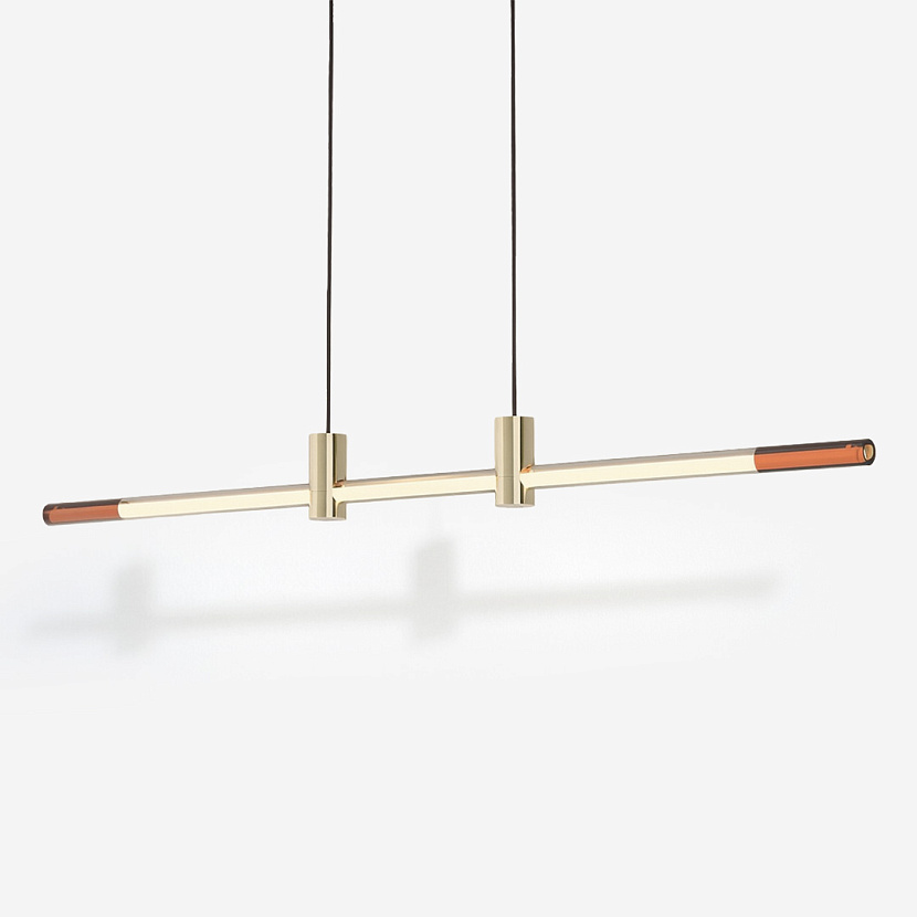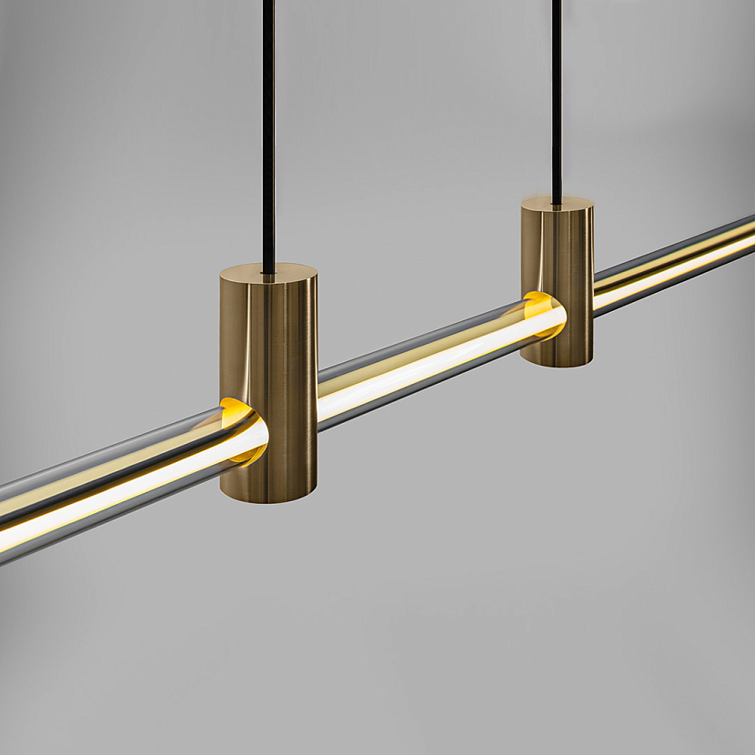 Отличительная особенность подвесного светильника Line — тонкий баланс лёгкого и массивного. Трубка из прочного боросиликатного стекла проходит сквозь бронзовые крепления, подчёркивая контраст материалов. Затемнение «под янтарь» усиливает визуальный эффект минималистичного изделия.