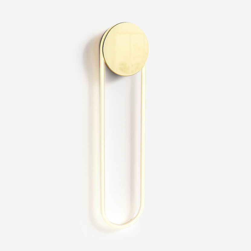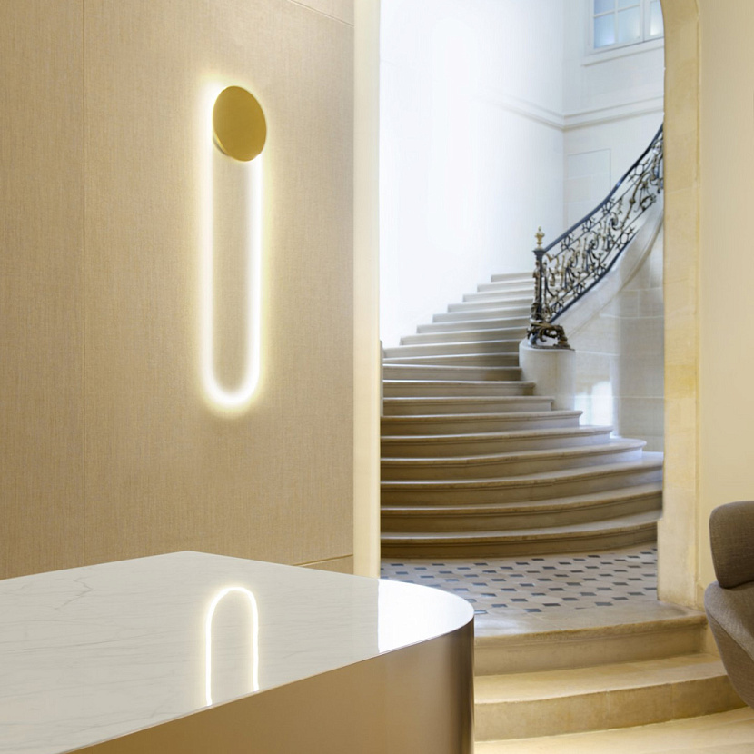 RA Wall — настенный светильник, органично интегрирующийся в окружающее пространство. Замкнутая неоновая трубка излучает яркий свет, мягко рассеивающийся на стене. Латунный диск закрывает часть источника света, металлическая поверхность отражает цвета пространства.