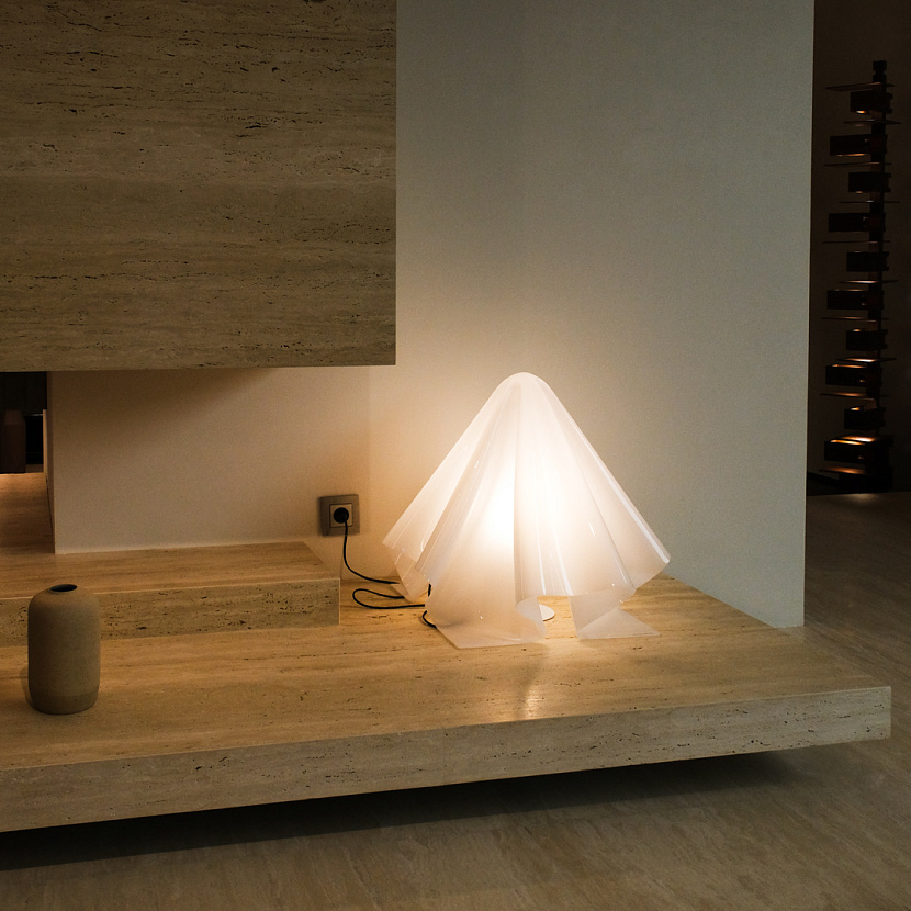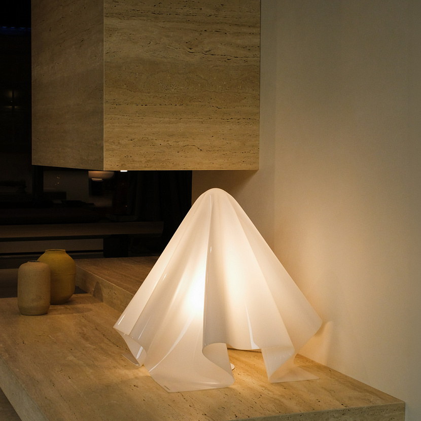 Настольная лампа K-SERIES (Oba-Q), дизайн 1972 года Сиро Кураматы. Название Oba-Q звучит как призрак по-японски: этот образ и стал источником вдохновения для дизайнера. Корпус из белого акрила мягко рассеивает свет: такой формы добиваются вручную, нагревая лист акрила и затем оставляя его естественно упасть вниз, а потом высохнуть в таком положении.