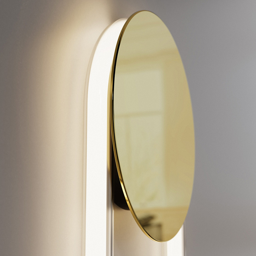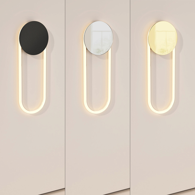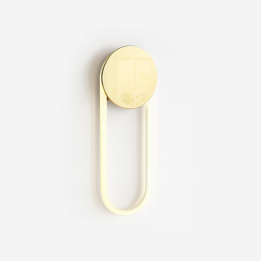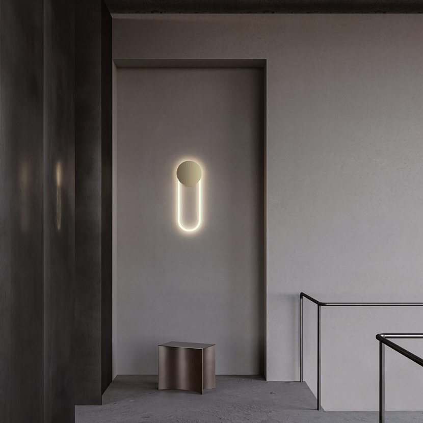 RA Wall — настенный светильник, органично интегрирующийся в окружающее пространство. Замкнутая неоновая трубка излучает яркий свет, мягко рассеивающийся на стене. Латунный диск закрывает часть источника света.