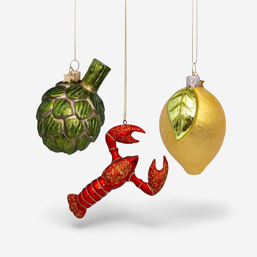 Набор ёлочных игрушек Gourmet II от голландского бренда Vondels. В комплект входят три украшения: в виде артишока, лимона и варёного рака.
