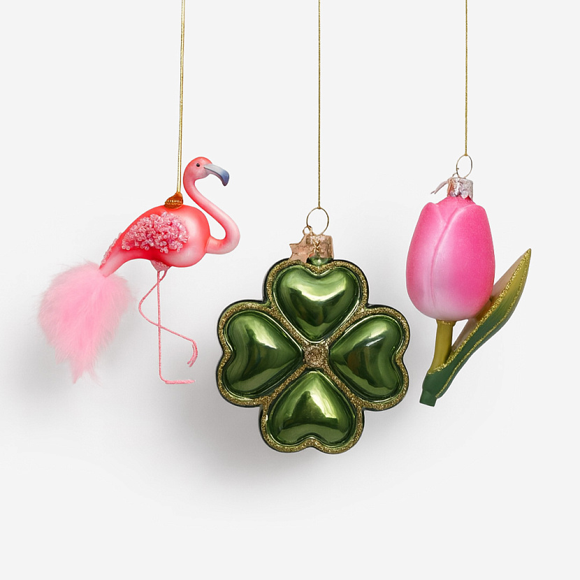 Набор ёлочных игрушек Christmas Glam II от голландского бренда Vondels. В комплект входят три украшения: в виде фламинго, четырёхлистного клевера и тюльпана.