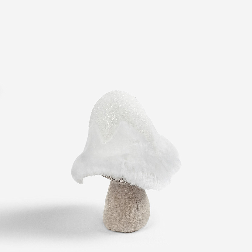 Новогоднее украшение в виде гриба с белоснежной шляпкой присыпанной блестящим снегом.
