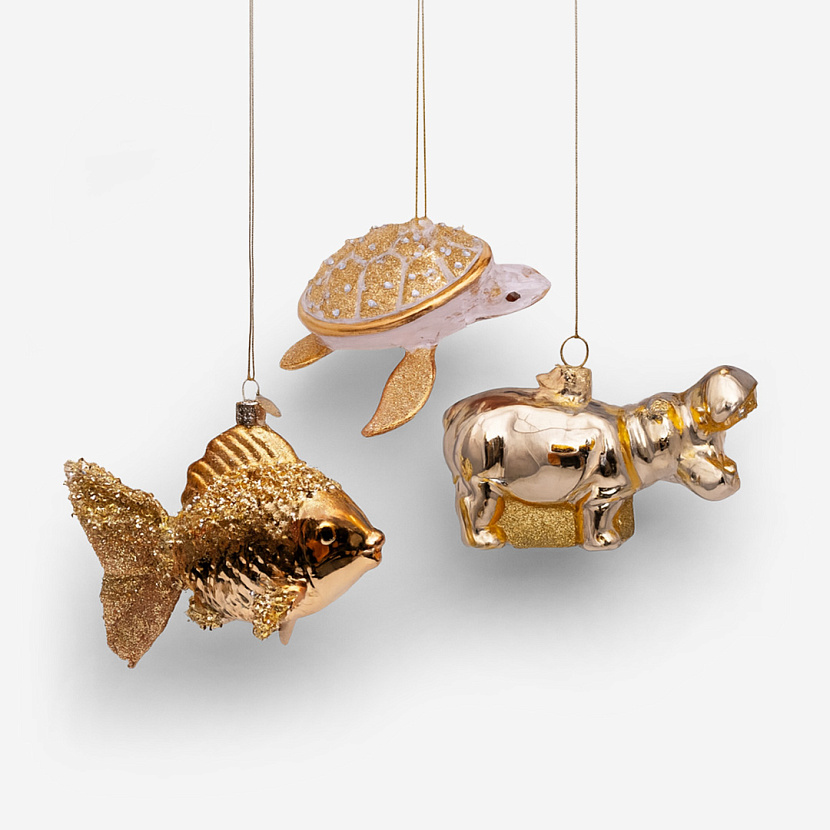 Набор ёлочных игрушек Fauna I от голландского бренда Vondels. В комплект входят три украшения: в виде рыбы, черепахи и бегемота.