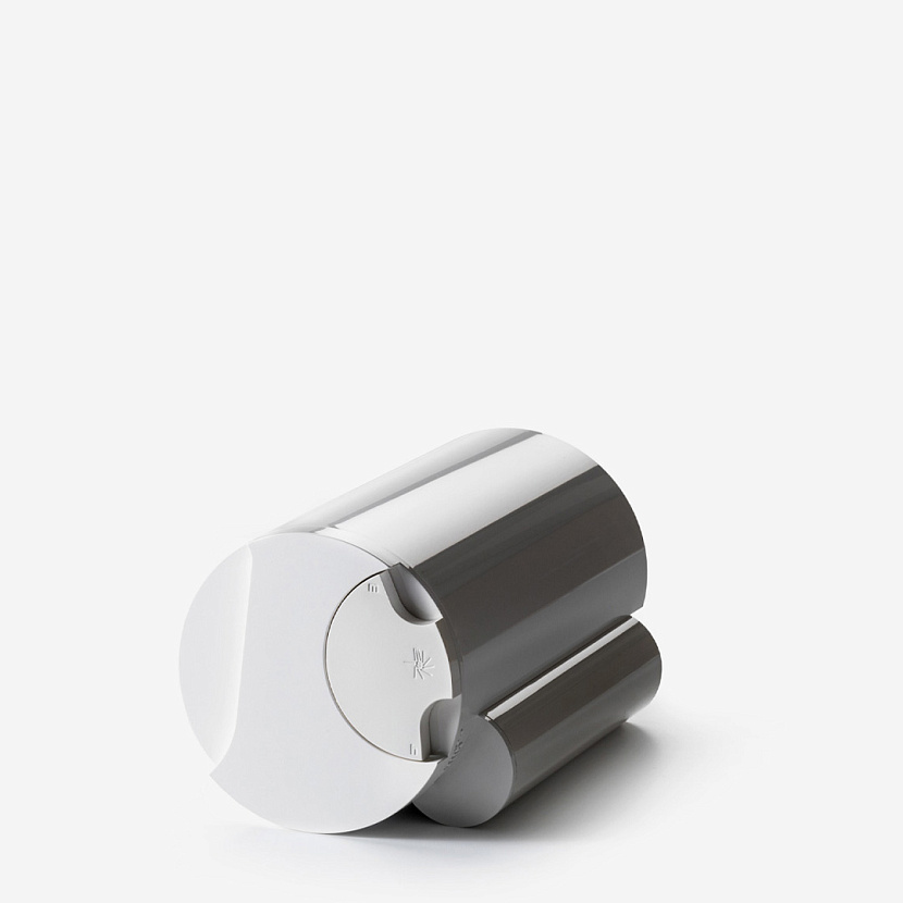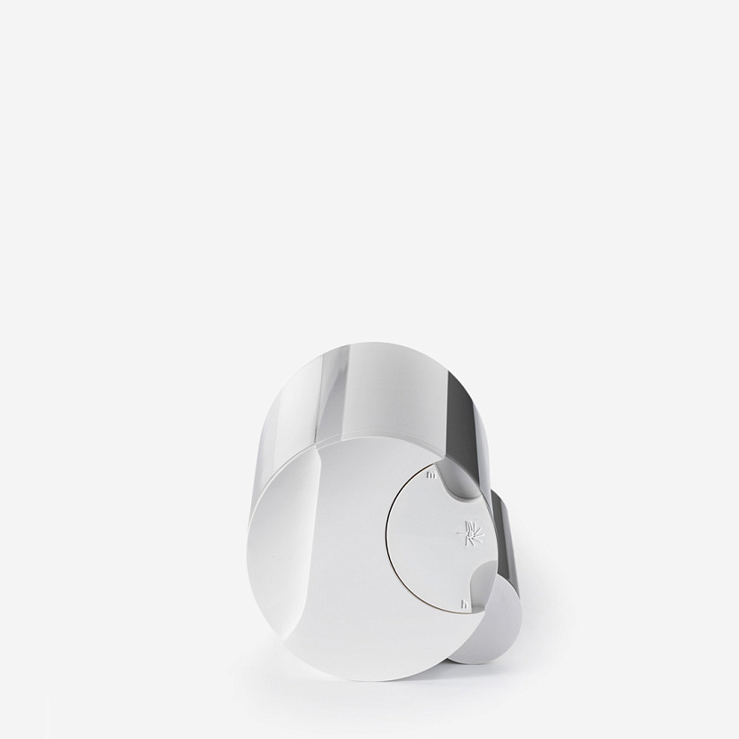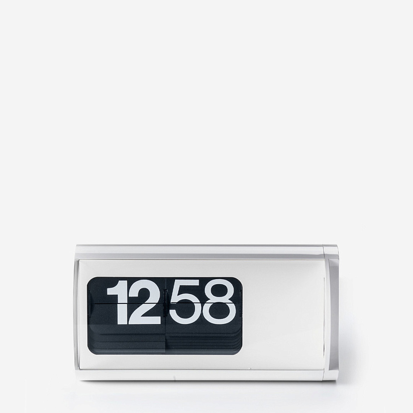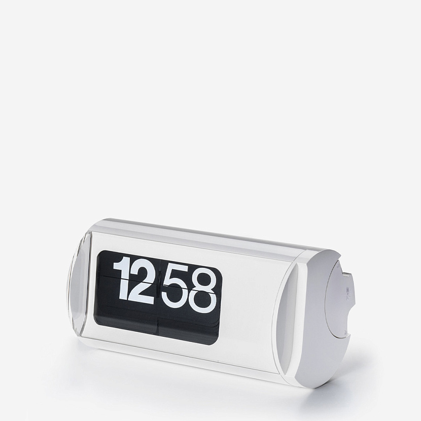 Настольные часы с перекидным механизмом Cifra 3, представлены в белом цвете. Модель была разработана дизайнером Джино Валле в 1960-х.